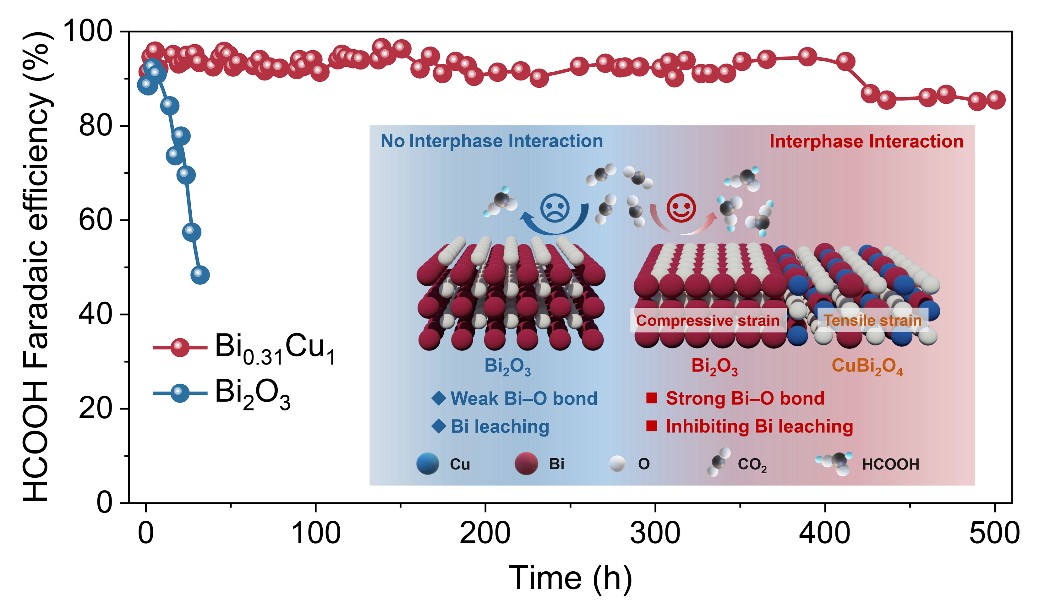 Furthermore, researchers revealed that the interphase interaction between the Bi2O3 phase and the CuBi2O4 phase within the Bi0.31Cu1 catalyst induces compressive strain and lattice contraction in the Bi2O3 phase. This strengthens the Bi−O bond, effectively suppressing Bi leaching during catalyst reconstruction and thus delivering both high activity and long-term durability. The general applicability of this metal-phase protection strategy was further demonstrated using a Bi-Mg bimetallic catalyst.